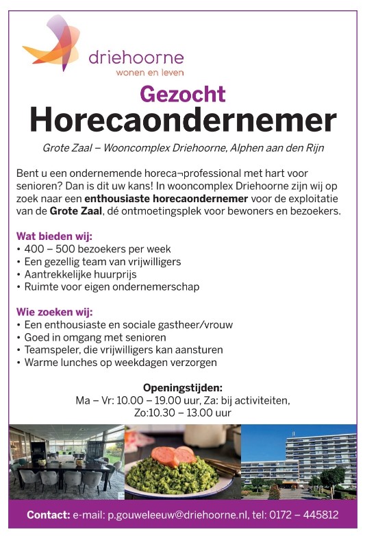 Per 1 juli 2026 zijn wij op zoek naar een nieuwe Horecaondernemer voor onze Grote Zaal, die het stokje van Willem over wil nemen. In het Alphens Nieuwsblad heeft daarom onderstaande advertentie gestaan. Heeft u interesse, of kent u iemand die interesse heeft? Neem even contact met ons op!
